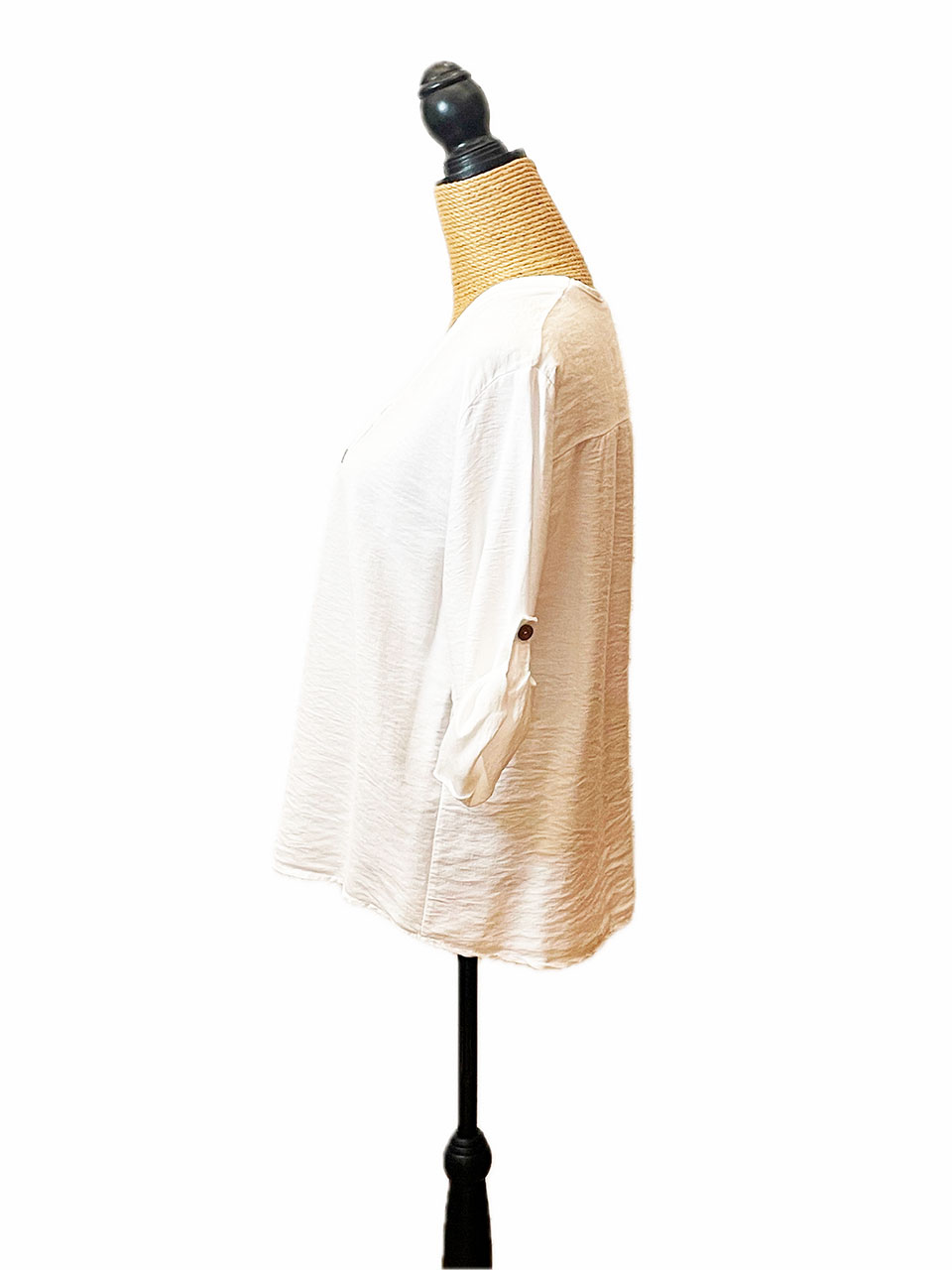Blusa blanca de cuello pico. Solo tiene 3 botones en el pecho. Se puede llevar manga larga o 3/4. Blusa muy fluida que permite que siente bien a cualquier silueta.