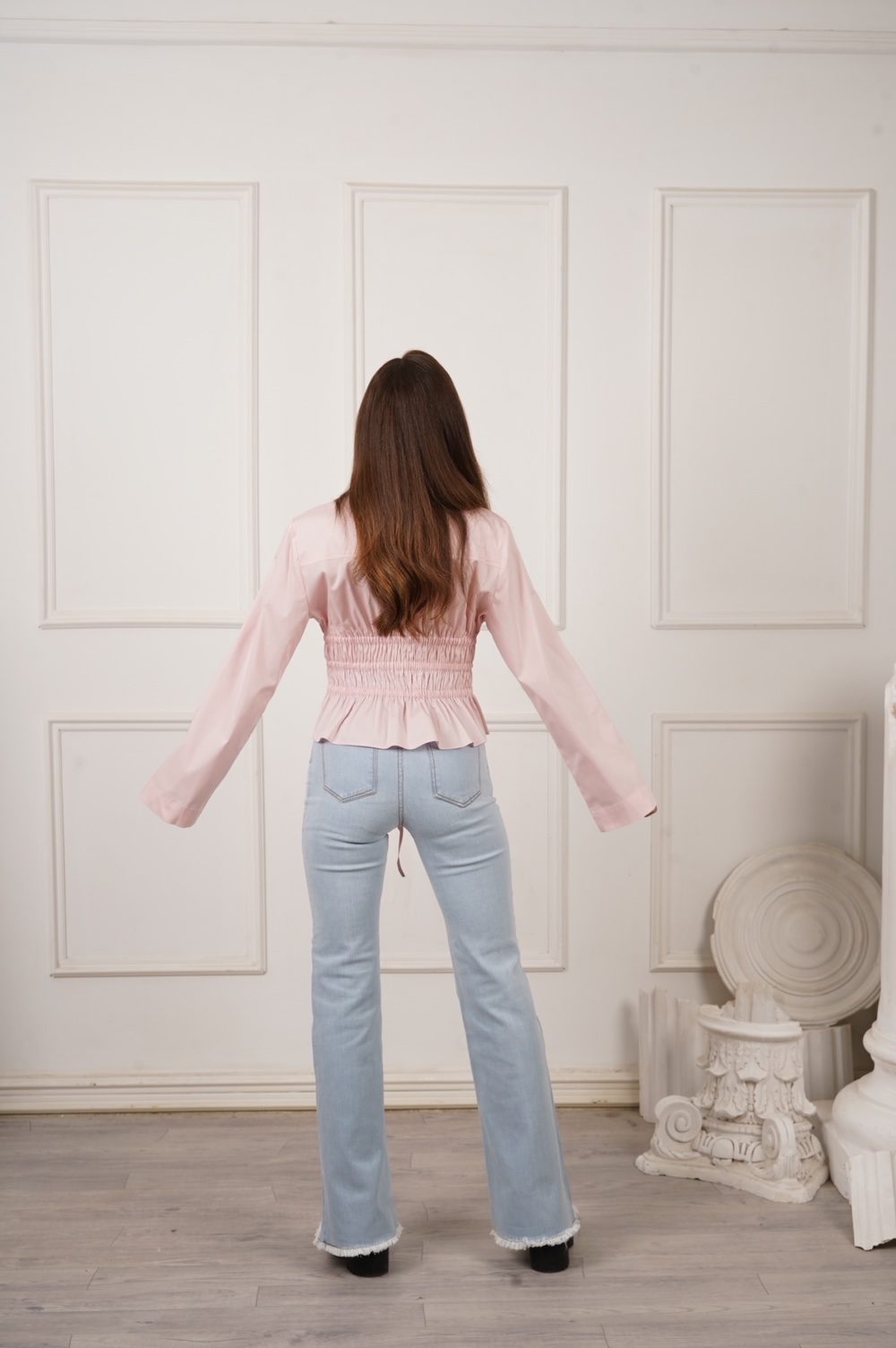 Blusa con cierre de lazado por delante y bajo péplum con disimulado volante. Cuello de solapa. En la parte de la cintura es elástica (tipo corsé) para marca la cintura, para así resaltar la silueta femenina. Una prenda en tendencia que no puede faltar en el armario.