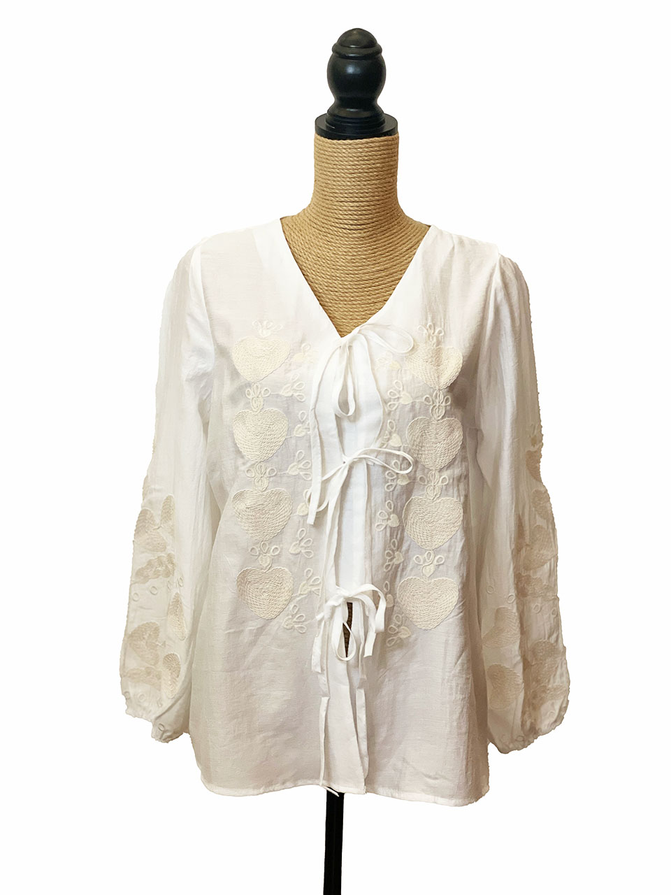 Blusa de manga larga bombacha. Se cierra con tres cintas en el medio de la parte delantera de la camisa. Tiene un pequeño estampado de color beige, que le da un toque moderno y elegante. Es una prenda muy fresca e incluso la puedes utilizar abierta como chaqueta.