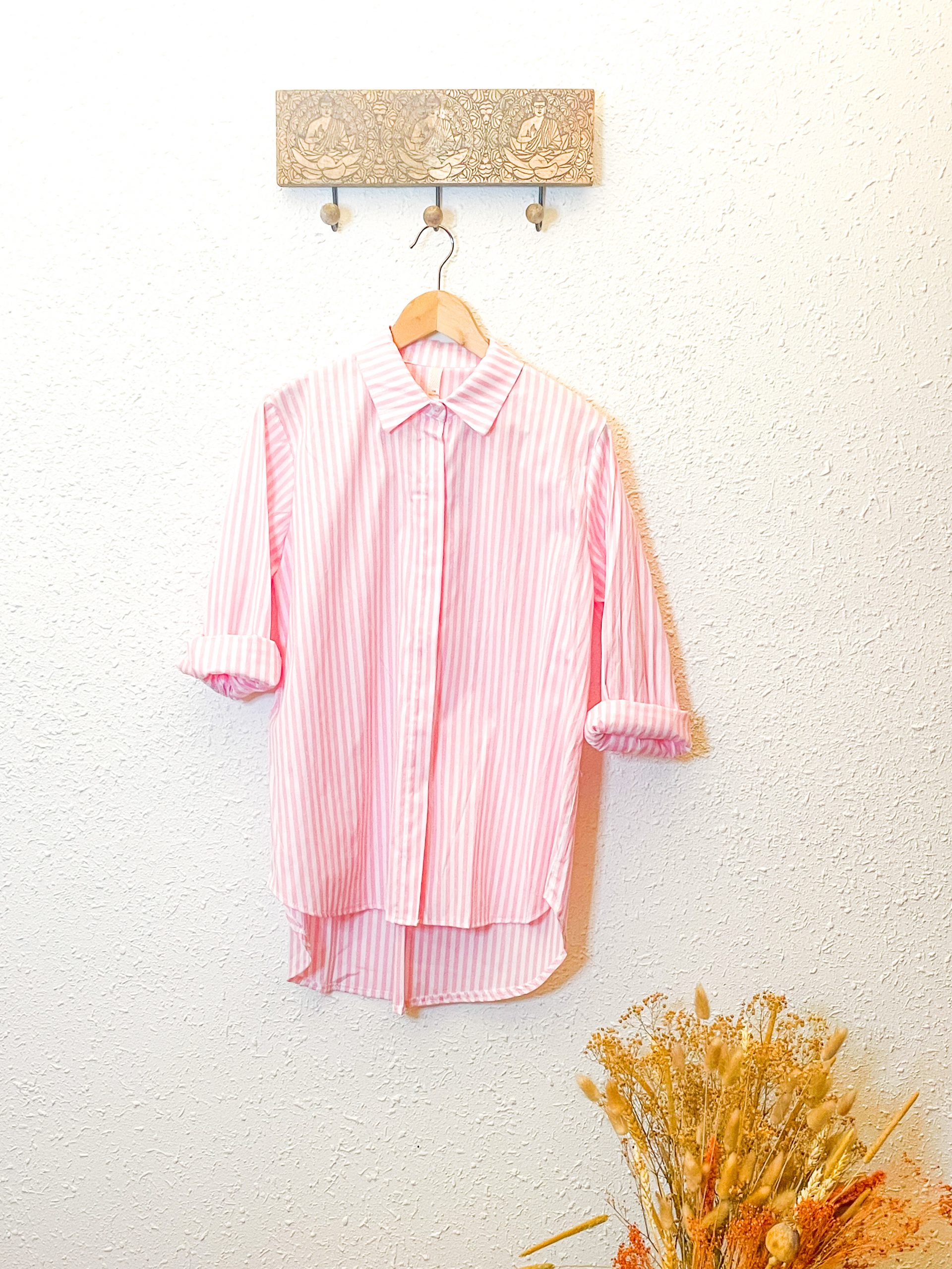 Blusa abotonada de rayas ancha en varios colores. Las rayas anchas le dan un toque moderno. Cuello de solapa, y los botines quedan escondidos, lo cual da un toque de elegancia.