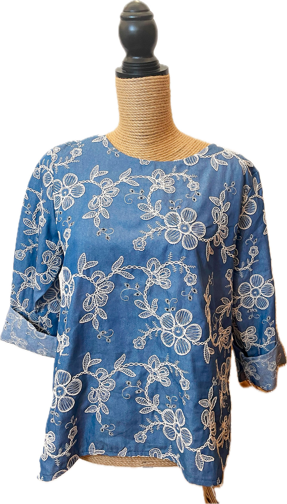 Blusa azul con estampado floral en crudo. Cuello redondo y más largo de la parte trasera que la de delante. Tejido muy agradable y muy combinable para cualquier outfit.