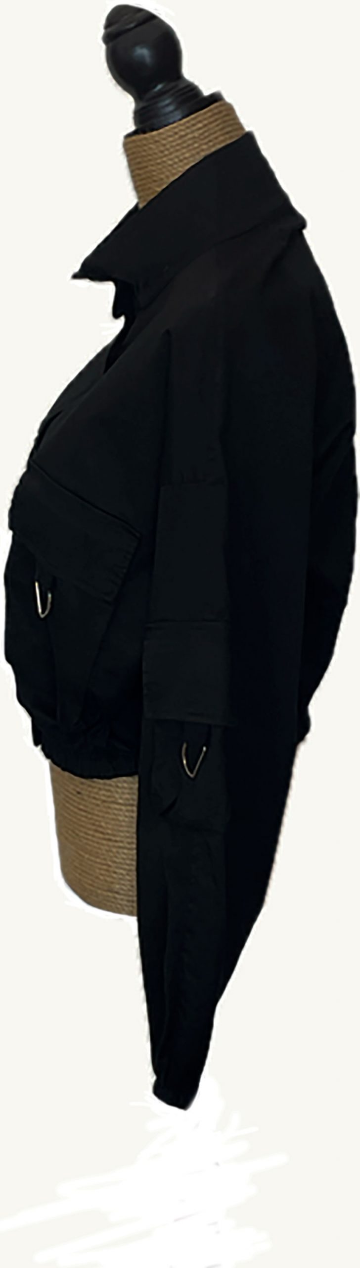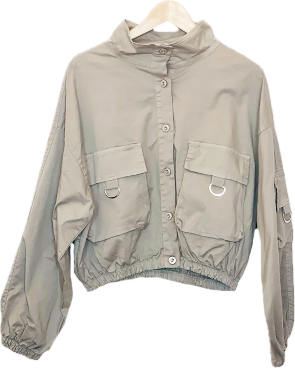 Cazadora oversize estilo bomber pero imitación chaqueta tejana. Tiene las mangas abombachadas, que hace que le dé un toque moderno y casual. Es corta, botonada y tiene dos bolsillos grandes en la parte delantera.
