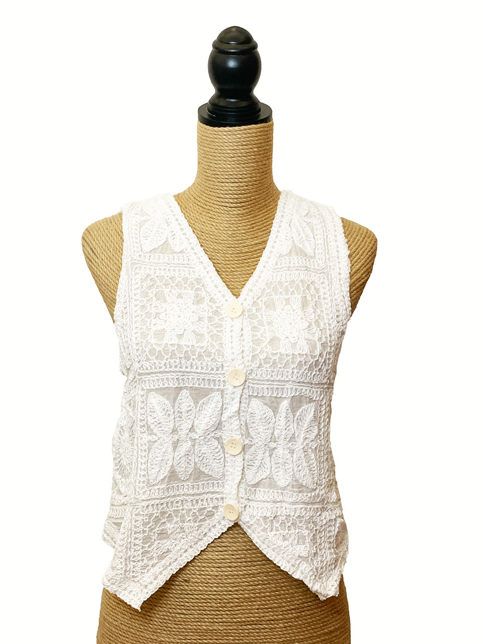 Chaleco blanco sin mangas. Tiene botones falsos y el estampado es de puntilla. El tejido es muy agradable. Una prenda que está en tendencia y muy fresca.