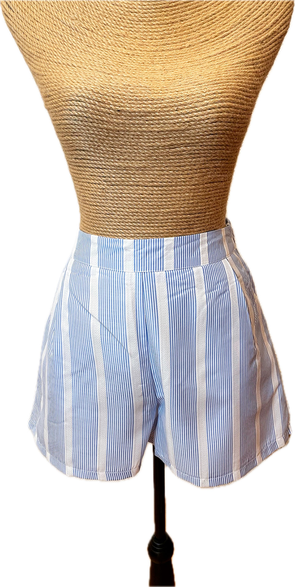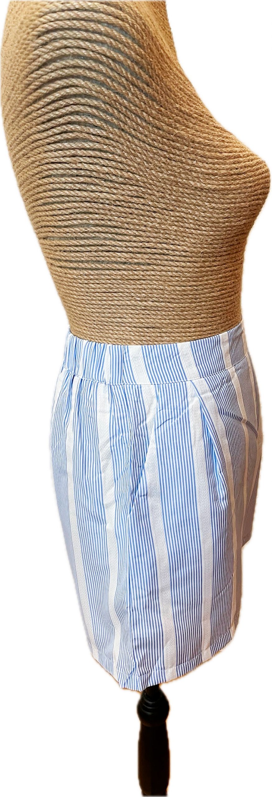 Short corto de rayas finas azul cielo y blanco. Tiene bolsillos y se abroche con una cremallera en el lateral que no se ve. Una prenda muy elegante y moderna a la vez. El tejido es muy fresco y el corte tiene estiliza la silueta.