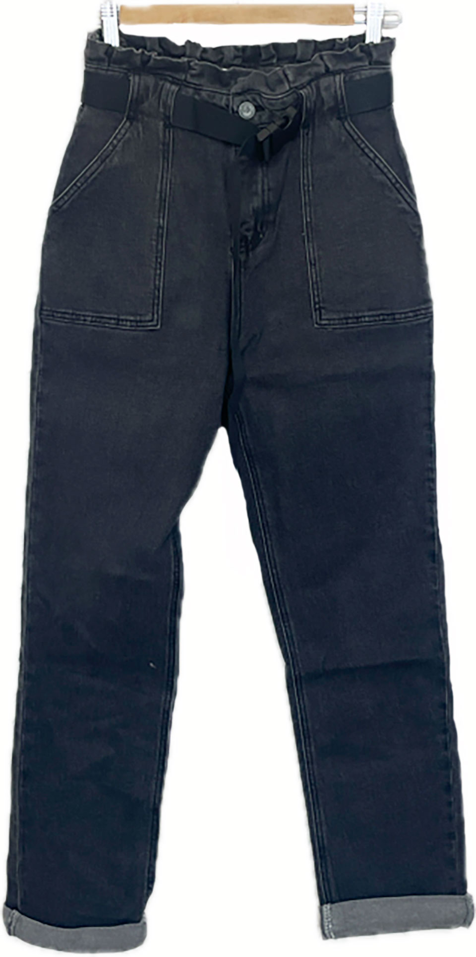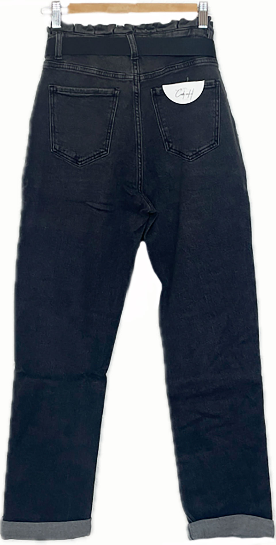 Tejano gris recto con volante en cintura y cinturón. La cintura es alta, lo cual hace que estilice la silueta. Tiene el componente elástico que permite que le tenga un toque de comodidad. Ideal para completar tu outfit.