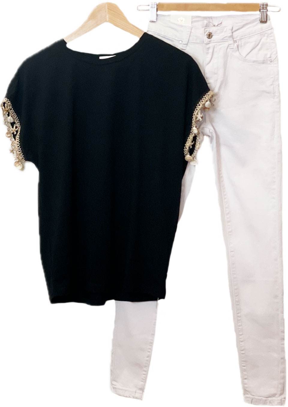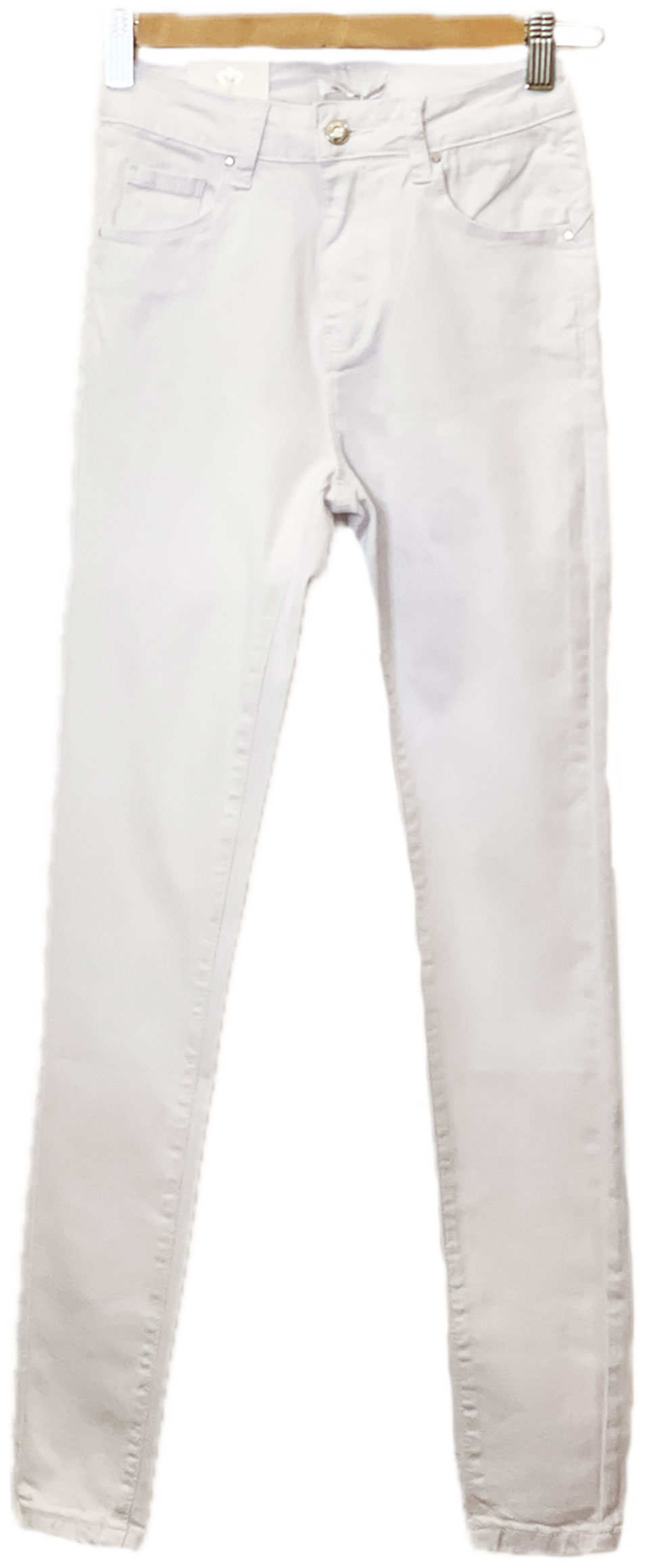 Tejano skinny blanco y cintura media. Tiene bolsillos tanto en la parte de delante como la trasera. El cierre con botón y cremallera. Muy cómodo, ya que tiene un poco de elástico, lo que hace que siempre quede igual. Estiliza mucho la silueta, de tal manera que la figura hace efecto de más delgada.