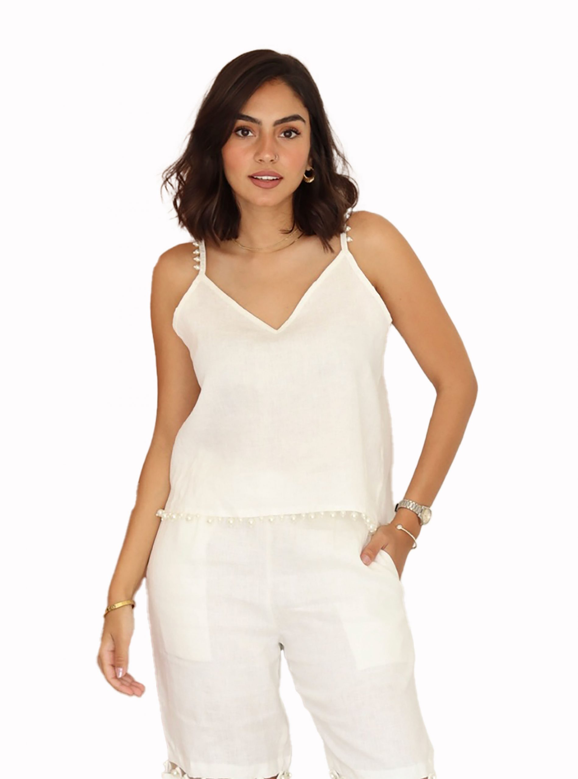 Top de tirante fino con cuello pico. Tanto en la parte de los tirantes como el acabado de la prenda tiene perlas blancas. El toque de las perlas hace que sea una prenda muy elegante y orinal. Una prenda única que siempre va a quedar bien para cualquier outfit. El tejido es muy agradable y fresco.