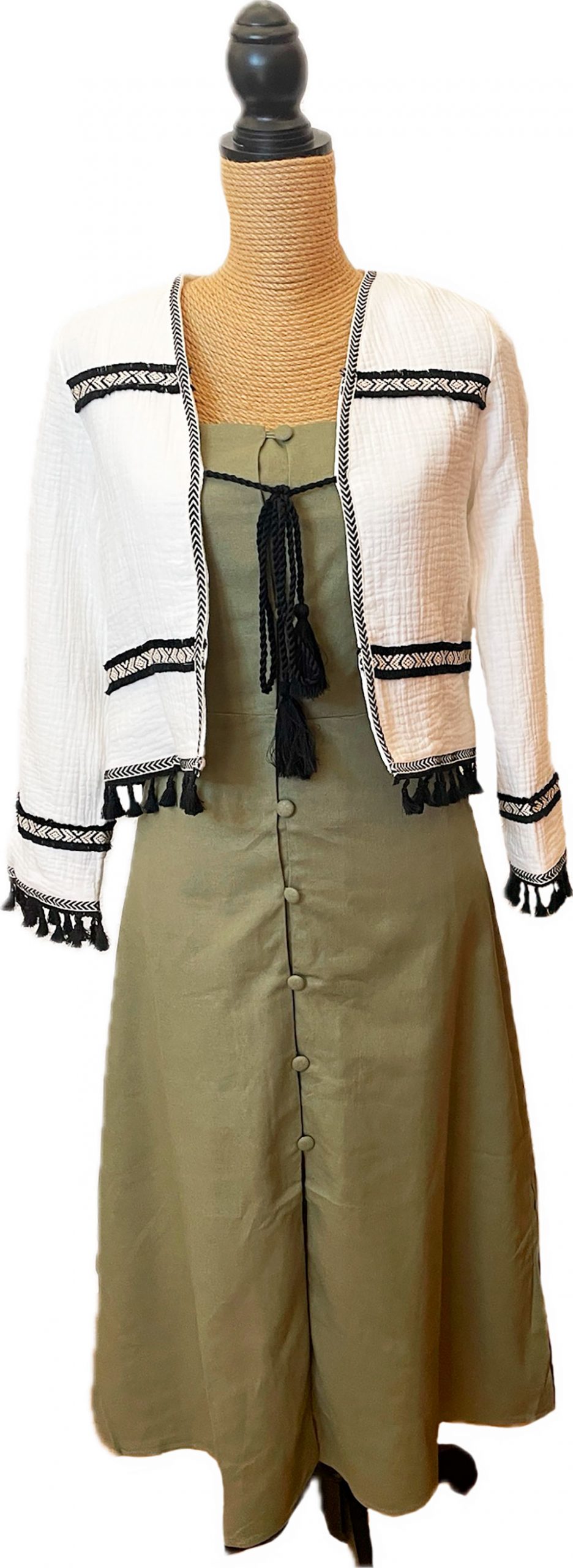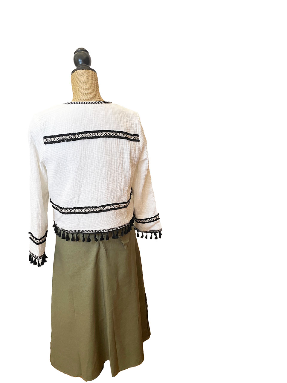 Chaqueta corta blanca étnica, que se abrocha con un cordel que acaba en pompón. Las mangas son con pequeña campana para darle un toque diferente y elegante. Una prenda muy práctica para completar cualquier outfit e ideal para primavera-verano.