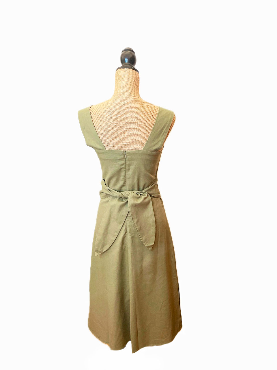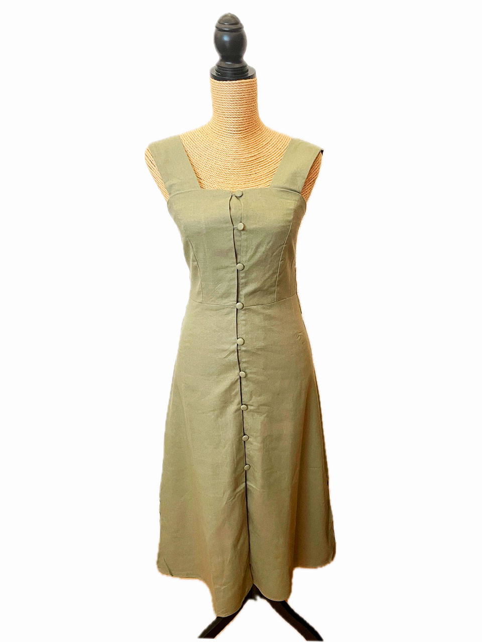 Vestido largo de tirante ancho con botones con apertura al final del vestido, en los laterales. Tiene cremallera en la parte trasera, bolsillos en los laterales y a la altura de la cintura, en la parte de delante, tiene para hacer un nudo, que tambien se puede hacer en la parte trasera. Contiene forro, que acaba encima
